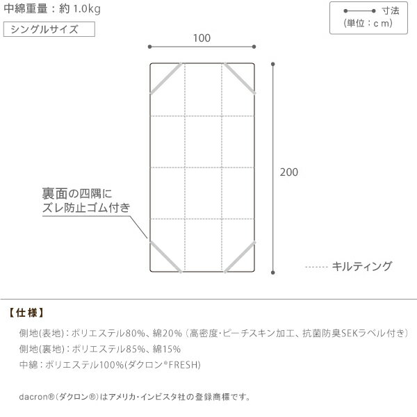 【仕様】 側地(表地):ポリエステル80%、綿20%(高密度・ピーチスキン加工・抗菌防臭SEKラベル付) 側地(裏地):ポリエステル85%、綿15% 中綿:ポリエステル100%(ダクロンメモレル、ダクロンアクア) 【サイズ】 100x200cm 重量:約1.5kg 布団・マットレスはこちら 布団・マットレスカテゴリではさまざまな布団やマットレスをご覧いただけます。