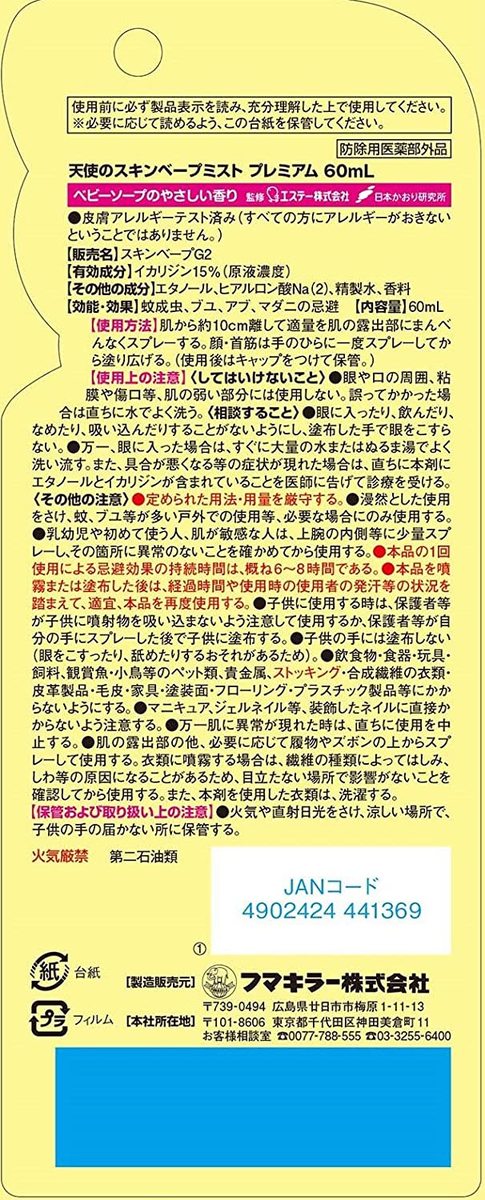 天使のスキンベープ 虫除けスプレー イカリジン ミストタイプ 60ml プレミアム ベビーソープの香り